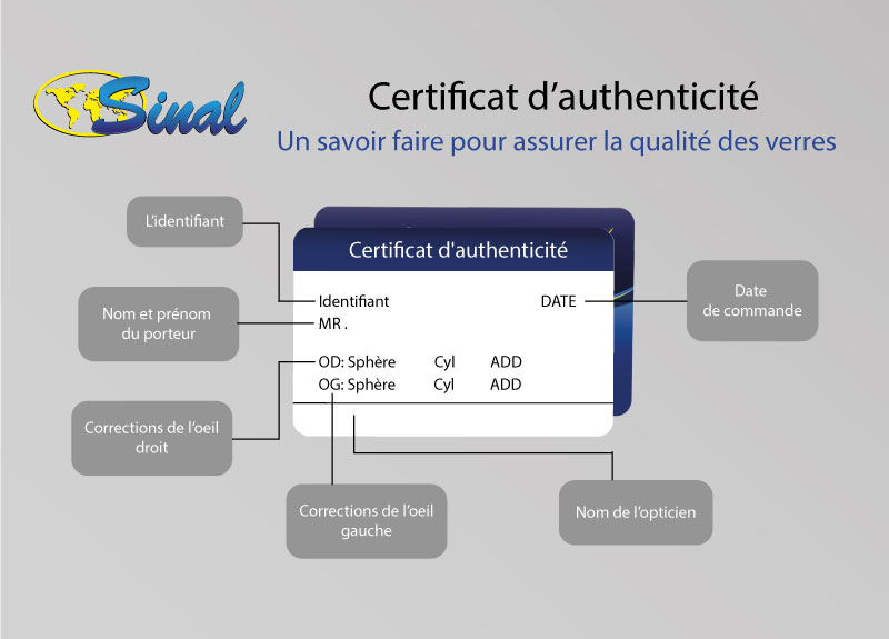 Un certificat d'authenticité assure au porteur que les verres qu'il a acquit sont bien conformes à la désignation donnée et précise les caractéristiques des verres.